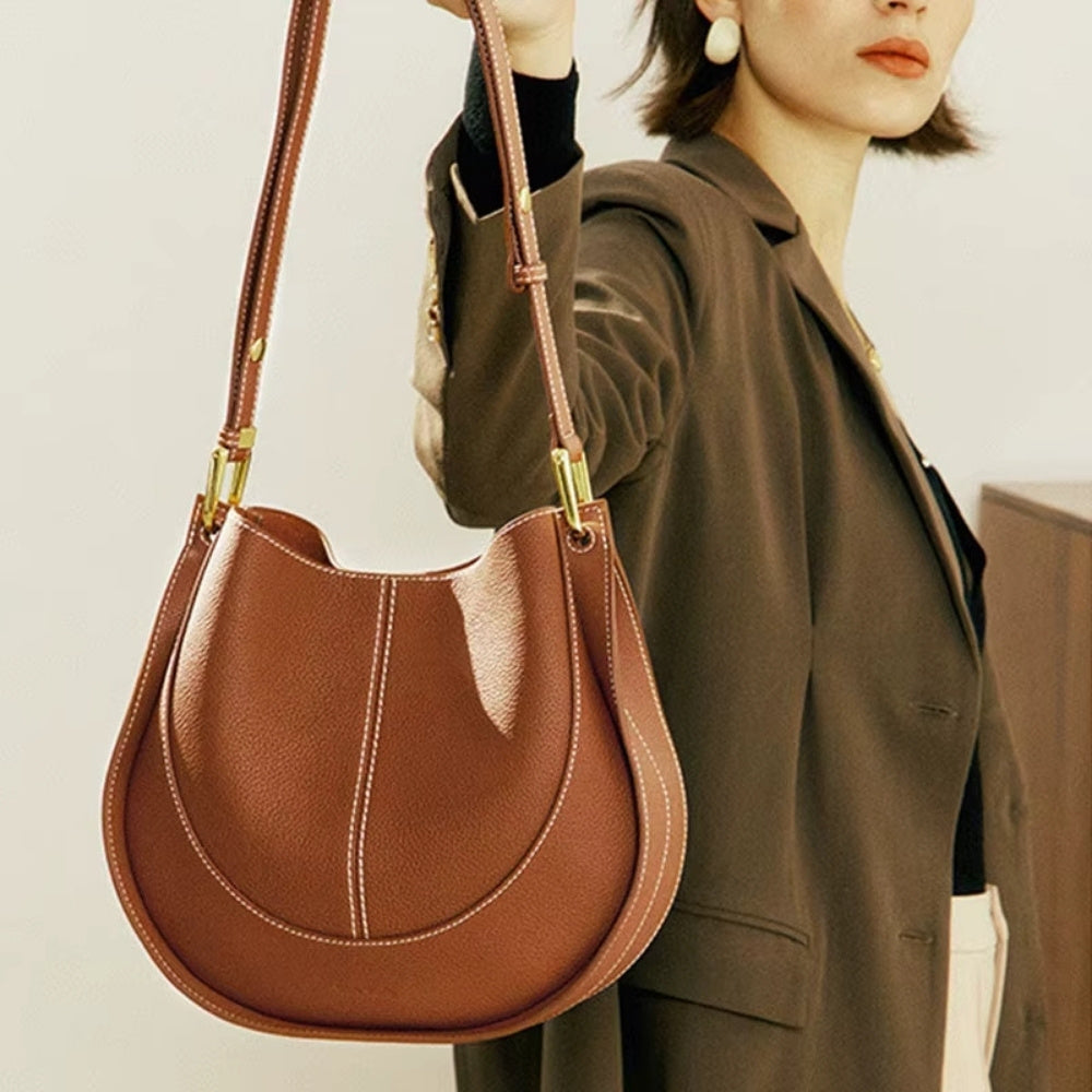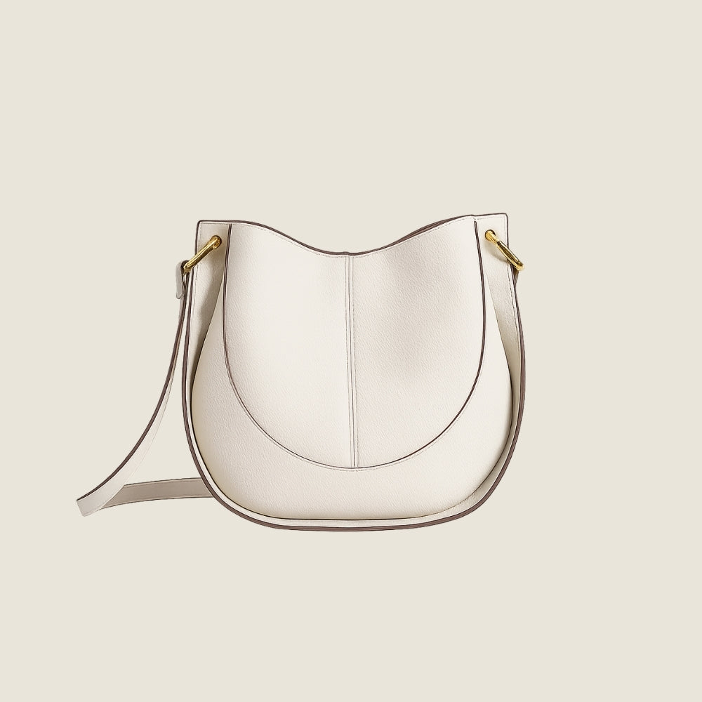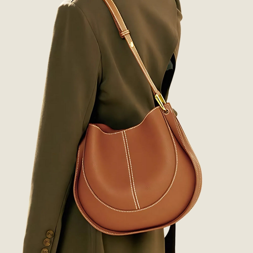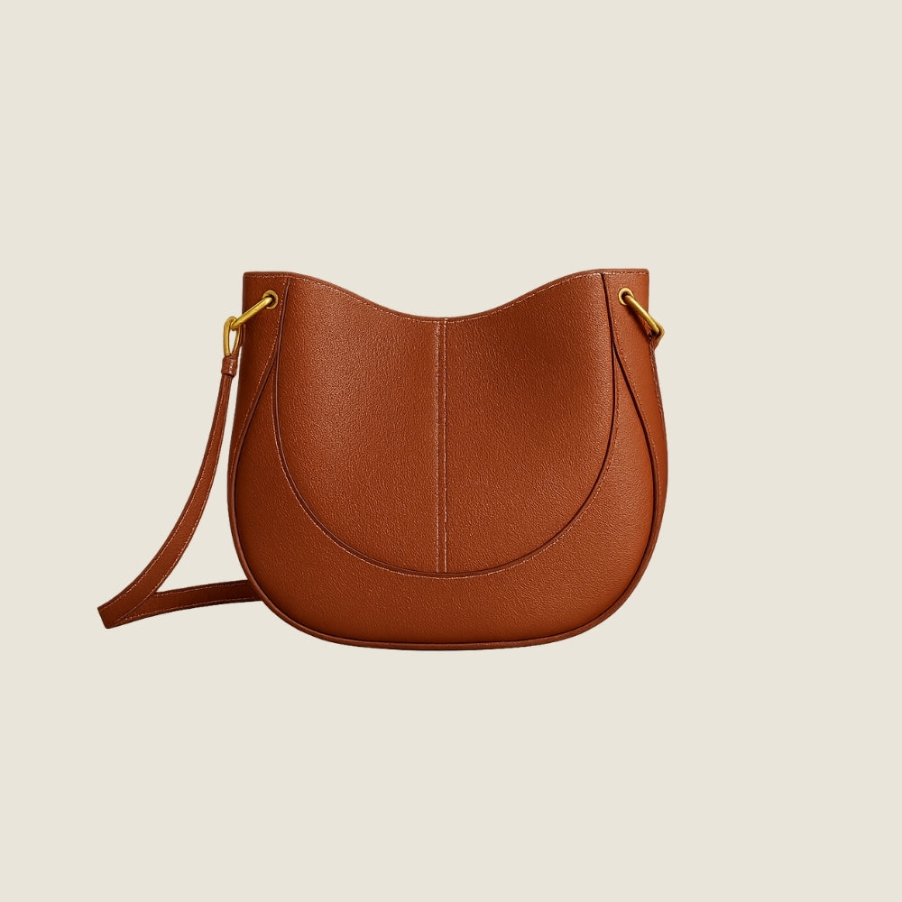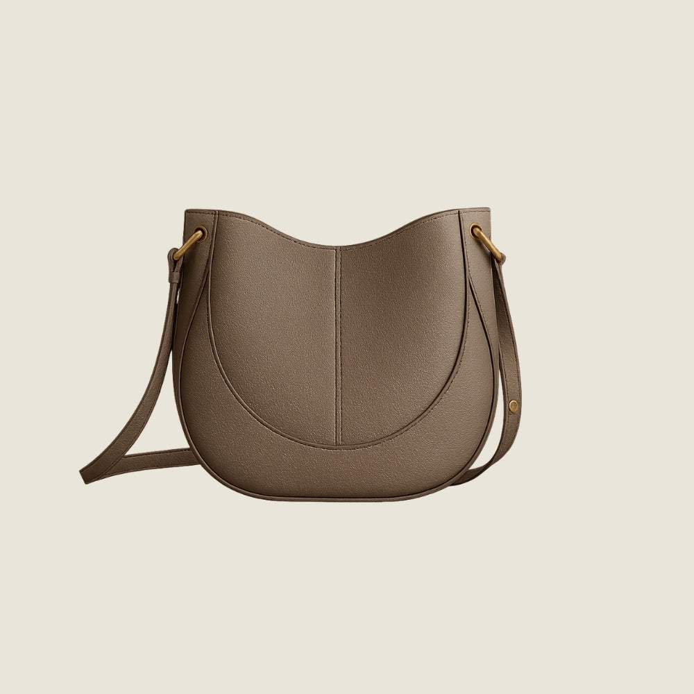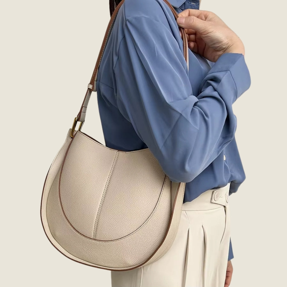 Upptäck en modern tolkning av den klassiska sadelväskan. Med sin mjuka, organiska form och distinkta kontrastsömmar kombinerar denna väska en avspänd elegans med en tydlig hantverkskänsla. Den är lika praktisk som den är vacker, med en smart, uttagbar innerpåse som håller ordning på dina värdesaker.