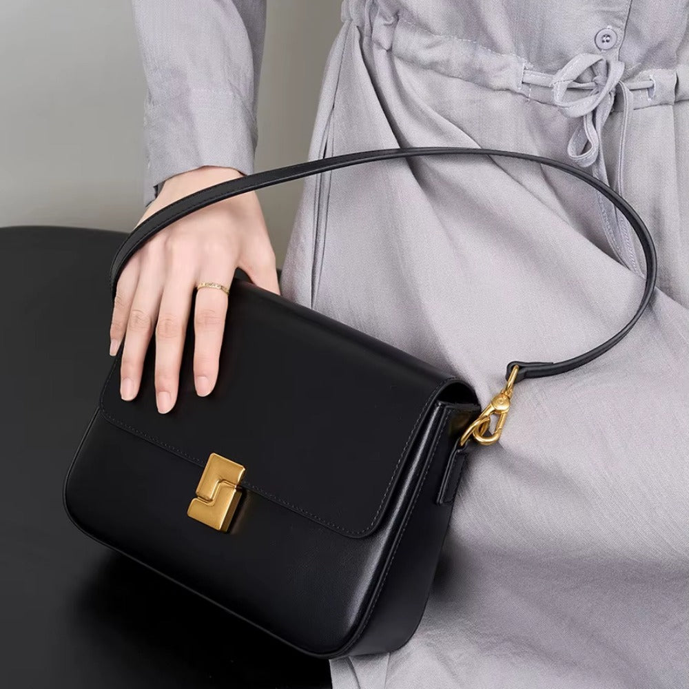 En tidlös siluett möter modern funktionalitet. Denna sofistikerade axelremsväska är designad för att ge en polerad finish till varje outfit. Väskans rena linjer och strukturerade form kombineras med en justerbar rem som gör den lika praktisk som stilfull – perfekt för allt från jobbmöten till helgens ärenden.